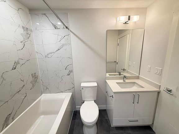 Large windowsModern kitchenQuartz countertopsStainless-steel appliancesPrivate balconyIn-suite laundry