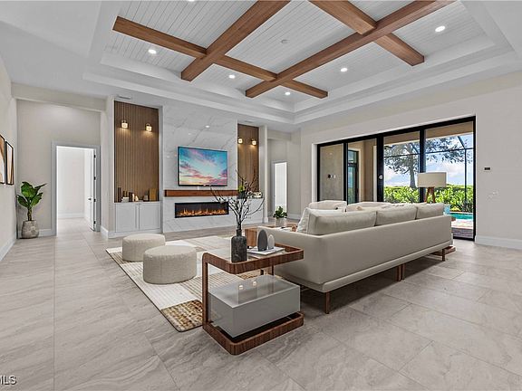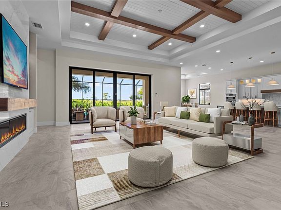 Luxury custom home with 3,944 SF under air (5,347 SF total) featuring 3 BEDROOMS, 4 FULL BATHS + 2 HALF BATHS + DEDICATED OFFICE, and a 3-car garage on an OVERSIZED 85’ WIDE ESTATE LOT with GOLF COURSE VIEWS in River Hall Country Club. Open floor plan with 12'+ CEILING HEIGHT THROUGHOUT (RISING TO 14' IN SELECT AREAS), oversized porcelain tile floors, multi-tiered tray ceilings with beams, IMPACT WINDOWS AND DOORS, electric fireplace, 10’ TALL SLIDERS, designer touches including wallpaper, custom cabinets and mantle, and a stunning quartz TV accent wall. Gourmet kitchen with UPGRADED BOSCH APPLIANCES AND A FULL-SIZE WINE REFRIGERATOR, upgraded quartz countertops with waterfall sides, a separate WET BAR FOR ENTERTAINING and COFFEE BAR both with decorative tile accents. Owner’s suite offers a spa-inspired bath with oversized glass-enclosed shower (fixed, rainfall, and body sprayers), and a freestanding tub. Outdoor living features a screen-enclosed panoramic lanai, POOL AND SPA, and an OUTDOOR KITCHEN. River Hall Country Club features a championship 18-HOLE DAVIS LOVE III, DESIGNED GOLF COURSE and FULL RESORT STYLE AMENITIES with LOW GOLF / HOA FEES. Amazing NO EQUITY MEMBERSHIP requirements, NO INITIATION FEES, and NO FOOD MINIMUMS. The Community also includes a Lakeside Pool and Tiki Bar Restaurant, a separate Golf Course Clubhouse Restaurant, Lagoon Style Pool, Full Gym, Pickleball, Tennis, an In-Community Elementary School, and a new Fire Station. Centrally located to I-75, RSW, and Downtown Fort Myers. Come tour this stunning, move-in-ready estate home! PLEASE NOTE: HOME IS VIRTUALLY STAGED FOR REPRESENTATIVE PURPOSES.