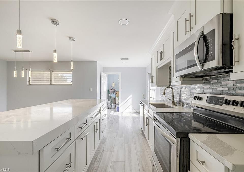 Large islandGranite countertopsSpacious backyardFlex roomModern kitchenVinyl plank flooringScreened-in patio