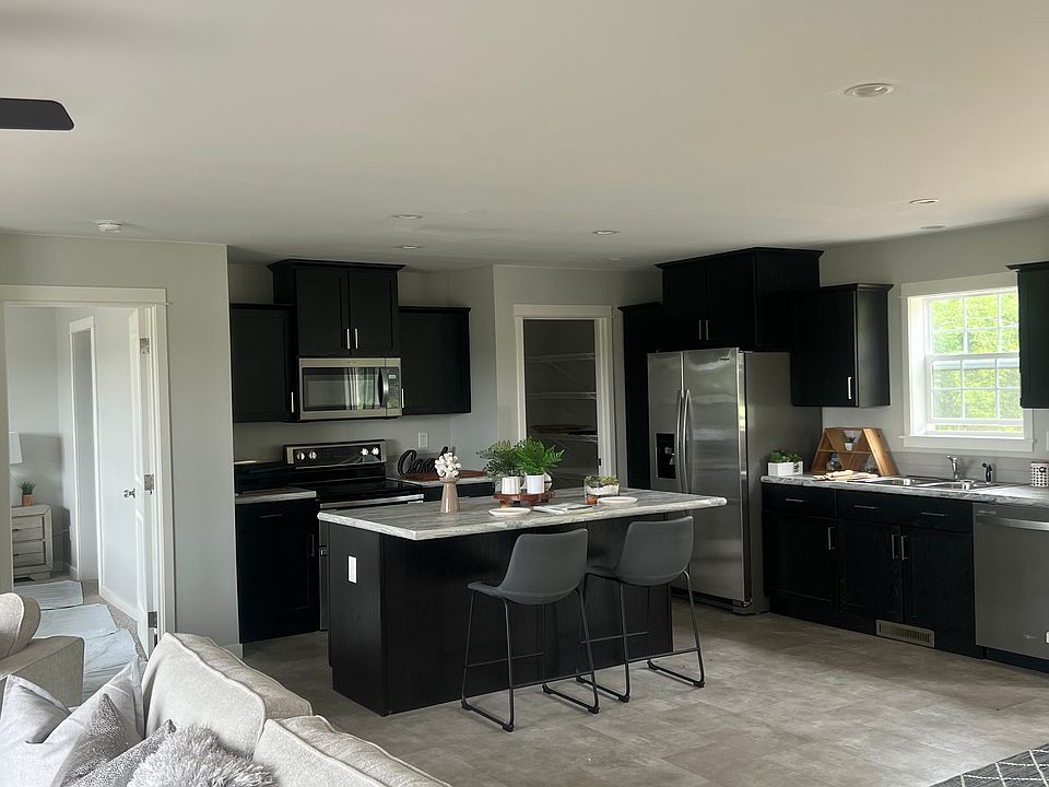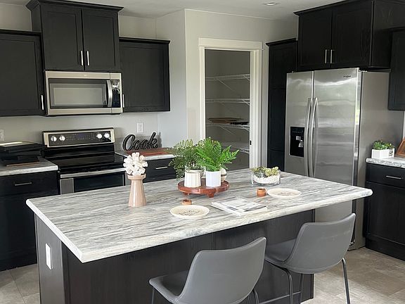 With 1,750 square feet of open living space, you'll enjoy a bright, thoughtfully designed layout featuring a modern kitchen with dark brown cabinetry, stainless steel appliances, a large center island, and a walk-in pantry. The spacious living area is accented by soft carpet, large windows, and sleek interior. Both bathrooms include modern fixtures, fresh tilework, and contemporary vanities.