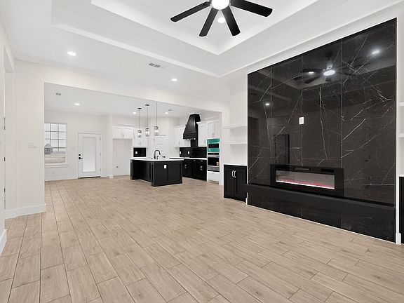 Stunning 3-bedroom, 2.5 bath modern farmhouse new construction. Featuring board-and-batten siding with stone accents and a welcoming covered entry, this home blends timeless curb appeal with contemporary luxury. Inside, enjoy a bright open-concept layout with designer finishes throughout, including two-tone cabinetry, quartz countertops, a bold black subway tile backsplash, matte black fixtures, and built-in stainless appliances. The spacious living area is anchored by a breathtaking floor-to-ceiling fireplace feature wall, creating the perfect statement centerpiece for entertaining or relaxing. The private primary suite includes a large walk-in closet and spa-inspired bath with dual vanities and modern finishes. Two additional bedrooms provide flexibility for guests, family, or a home office. Complete with a 2-car garage and modern craftsmanship throughout this home is the perfect blend of farmhouse charm and upscale design.
