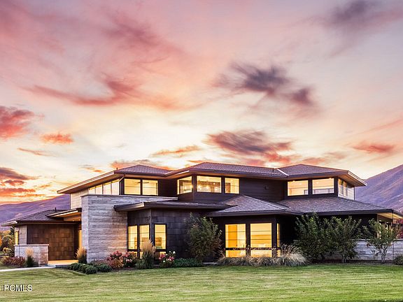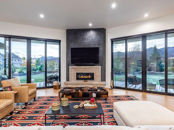 Enjoy main-level living in this stunning mountain contemporary home in Midway. The home sits on a large, flat one-acre lot in Deer Ridge Estates with beautiful views of Mt Timpanogos and Snake Creek Canyon. In addition to the main house, there is a detached garage with a full one-bedroom apartment and a backyard pickleball court. The home has an open floor plan designed around a magnificent great room and kitchen. A gorgeous fireplace is positioned between two walls of glass doors and windows that open to an outdoor sitting area that has exterior motorized shades making it possible to enjoy this wonderful space throughout the year. The kitchen is incredible and is one of the signature spaces of the home. It boasts a large island, extensive cabinetry and countertop space, a huge pantry, and gourmet appliances that include a range that allows you to cook with either induction, gas, or via sous vide. The main level also features tall ceilings, exceptional finish work, large windows with motorized shades, and a primary suite that is designed to pamper. Upstairs there is plenty of room to gather between the family room and game room that steps up to a really cool rooftop deck complete with a fireplace and some of the best views in the neighborhood. The yard has manicured lawns with mature trees strategically planted along the property line for privacy. There is guest parking on the circular driveway in front of the home, as well as extra parking spaces near the garages. With Deer Creek and Jordanelle reservoirs so close, the detached garage is the ideal place to keep your boat. It is also large enough for an RV or the perfect place for toy storage. Plus, there is even additional RV parking on the north side of the detached garage. This home is only two years old and is absolutely gorgeous. It is the ideal property for a primary residence and with all of the outdoor recreational opportunities in the area (Deer Valley East Village is only 15 minutes away).