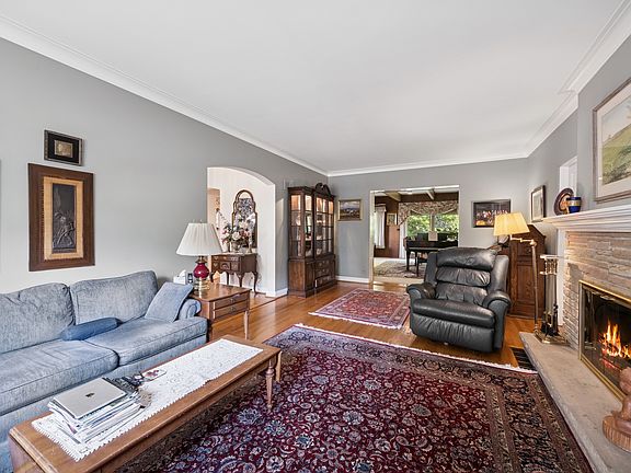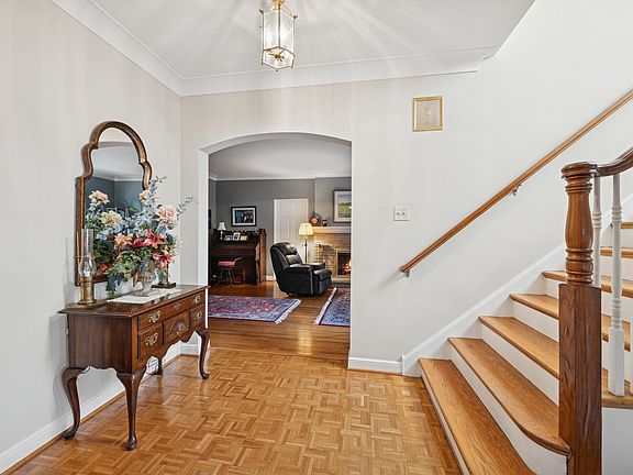 Stately brick colonial on professionally landscaped lot with flowering perennials & trees. Step into bright foyer with parquet floor & hall closet. Living room has wood-burning fireplace, hard wood floors & cove molding. Spacious dining room has hardwood floors & cove molding. Updated kitchen has ash cabinets, quartz countertops, built-in pantry, hardwood floor & recessed lighting. Very large family room with windows facing landscaped yard, beamed ceiling and featuring built-in cabinets offering plenty of storage, sliding door to outdoor deck & double closet. First floor also offers half bath and a separate room with closet which can be used as bedroom or den. Beautiful leaded glass window on staircase landing. Upstairs offers three bedrooms, hall bathroom & access to unfinished attic. Large finished basement recreation room with full bath & many built-in cabinets; also separate finished office with half bath and private exterior entrance; also there is a laundry/utility room with plenty of storage space. Attached tandem two car garage. Full air conditioning with two forced air furnaces. Newer windows throughout. All newer interior six panel wood doors. Fenced yard with brick walkways & patio. The Holidays are around the corner so you can be closed and settled by Thanksgiving. Make your appt today. Easy to show