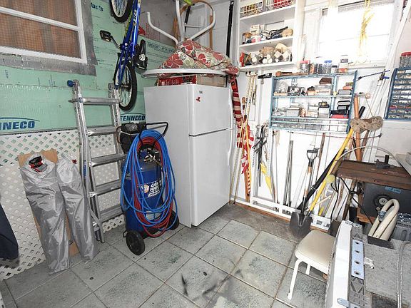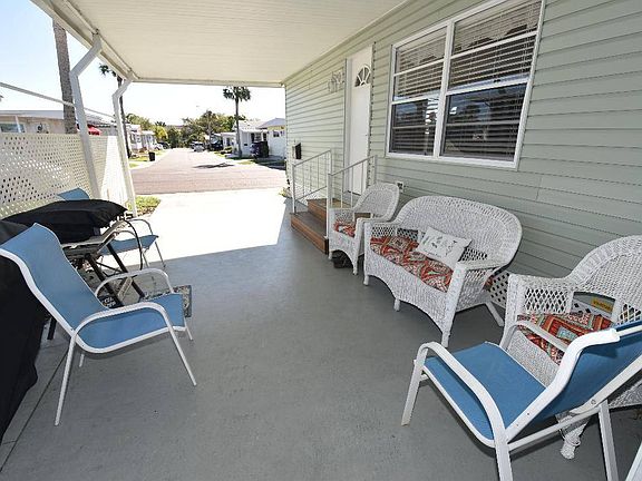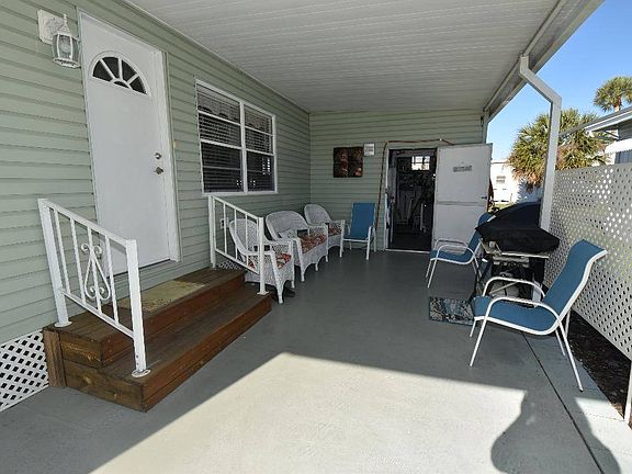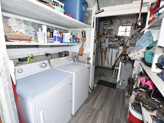 Nice wider wooden entry steps with railings. Light airy kitchen with small two seat table sitting next to a open pass through to adjourning room. Dining room table and hutch in larger dining area. Office area in front room with two small desks and a couch. Two bedrooms and two baths. Master bath has a walk-in shower. Large shed with washer/dryer, refrigerator and lots of shelves for storage.