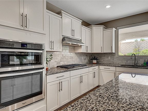 Gated Summerlin community in Segovia. This stunning home showcases stylish designer finishes, including stone accent walls, two-tone custom paint, LVP flooring, plantation shutters, upgraded window shades, a built-in hall tree, and elegant lighting and ceiling fans throughout. The chef’s kitchen is a true showpiece with a large center island, gleaming stainless steel appliances, pantry, and a convenient butler’s pantry. The main level includes a spacious home office, and a beautifully finished 3/4 bath located beside the downstairs bedroom. Upstairs offers a generous loft, laundry room with sink and cabinets, two secondary bedrooms, and a full bath. The luxurious ensuite primary bedroom is a serene retreat with a private balcony boasting panoramic mountain views. The backyard is fully finished with pavers, lush landscaping, and a custom full-length patio cover featuring a privacy wall for added seclusion.
