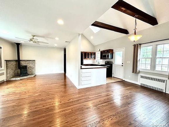 Welcome home to this beautifully maintained ranch situated on a corner, fully fenced lot with a covered front porch. The kitchen offers stainless steel appliances including a new dishwasher, gas cooking and is open to the dining area and den. Features include a new driveway (2025), new central air (2025), natural gas heat, vaulted ceilings with wood beams and skylights, gleaming hardwood floors, and a cozy wood-burning fireplace, inground sprinklers, 200 amp service, roof (2010), LED hi-hats, 20' x 30' deck with outdoor speakers, full basement, shed, and a water filtration system. This home is conveniently located near the Main Street shops and restaurants, Shorefront Park, and the Davis Park Ferry. Don't miss this one!