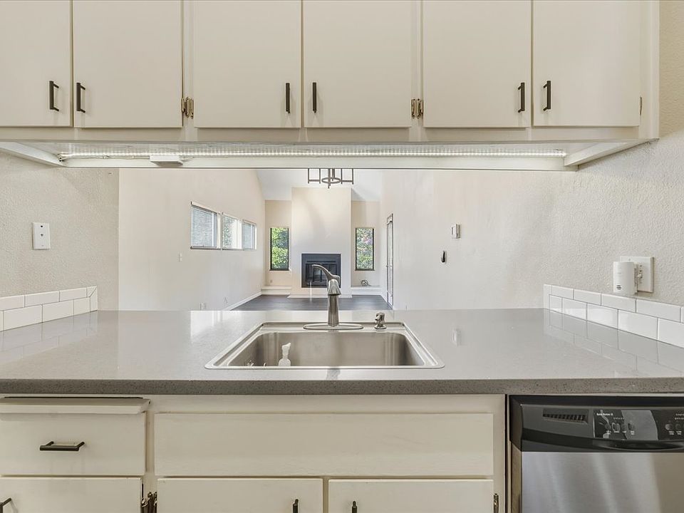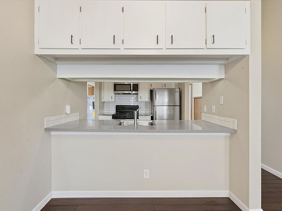 The updated galley kitchen features stainless steel appliances, including a dishwasher and a built-in microwave oven, a quartz countertop and a clean white tile backsplash.