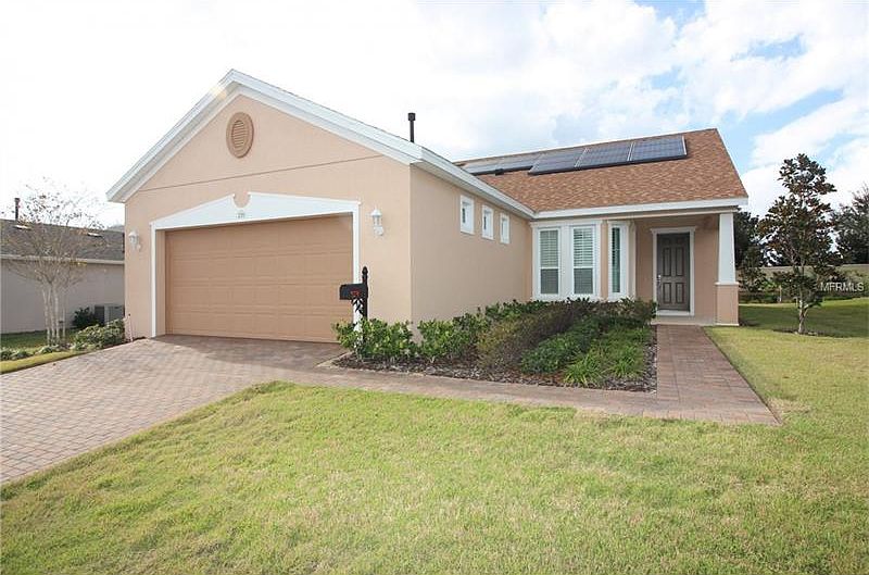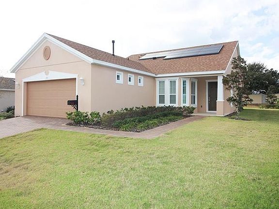 Come see this solar powered Gardenia floor plan home. This home has 2 bedrooms with 2 bathrooms, a den/office and great room with dining/living room combination. There is a nice flow to this floor plan with ceramic tile throughout. Kitchen cabinets are all upgraded to solid wood with deep pot drawers and soft close drawer slides. Center kitchen island is topped with a maple butcher block. Granite is also upgraded in the kitchen and baths have solid surface countertops. Every window in this home has 3.5inch plantation shutters for privacy and luxury detailing. The home faces eastward for amazing sunrises. No rear neighbors and lanai is screened to enjoy dining and entertaining or sipping your favorite beverage and reading a book. You can also enjoy the impressive 57,000 square foot clubhouse with restaurant, bar, grand ballroom, demonstration kitchen, golf simulator, card room, billiard room, yoga/group fitness, on site massage room and gym with state of the art equipment. Outdoor activities include: heated indoor/outdoor pool, indoor & outdoor hot tubs, pickle ball, tennis, bocce. Also offered are various levels of fitness classes including yoga, aerobics, tai chi, water aerobics and the list goes on and on. You can own right now in this Central Florida, resort-style oasis! Be sure to watch the virtual tour!