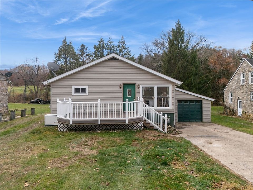 Welcome to 339 Weimer Ave, Laughlintown! This charming home features 3 bedrooms, 2 bathrooms, an attached garage, and a full lower level ready for your vision, with a full bathroom and a pellet stove, perfect for additional living, recreation, or storage space. From the spacious front deck, enter the living room where floor-to-ceiling windows fill the space with natural light and flow seamlessly into the dining and kitchen area. The kitchen boasts a gas stove and ample cabinet space, ideal for meal prep and storage. Bedrooms are generously sized with plenty of closet space, and the primary suite includes a sliding door that opens to the large backyard, offering potential for a deck or outdoor retreat. Enjoy the tranquil sounds of Naugle Run in your backyard, with the Rolling Rock Club Golf Course just beyond. Additional features include a full-house generator, shed, and a no-outlet road. This home combines space, functionality, and scenic surroundings, ready for you to make it yours.