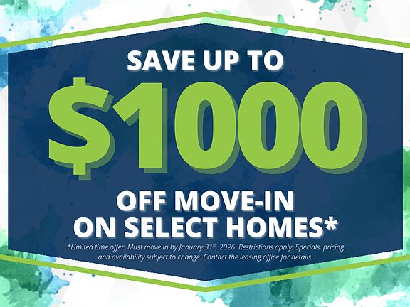 - Special offer! Save up to $1000 off move-in on select homes! *Limited time offer. Specials, pricing and availability subject to change daily. Contact the leasing office for details.