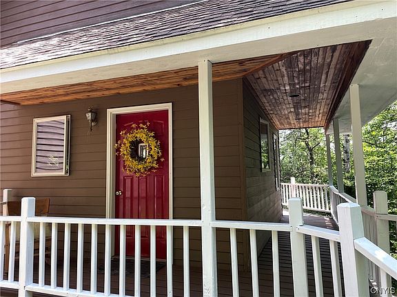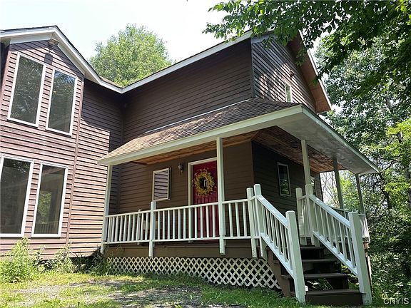 Drive up the tree-lined driveway and take a breath of fresh country air, you're home! This thoughtfully designed home brings the outside in, with views of nature from every window. Beautiful cherry floors upstairs and down with natural woodwork. Kitchen offers hand-built custom cherry cabinets, floor to ceiling windows and breakfast bar. Dining area flows into the living room with slider to rear deck. A half bath and mudroom with laundry area round out the downstairs. Upstairs features a lovely primary suite with cathedral ceiling, 4-piece bathroom and walk-in closet. Two cute bedrooms with closets offer abundant natural light. There is another full bath upstairs and the hall landing provides an additional reading/office space. Sq. footage does not include additional 736 sqft of dry unfinished walkout basement with so much potential. Don't forget the 6 acres out back for you to explore, hunt and just enjoy! A peaceful retreat just a short drive from Cazenovia.