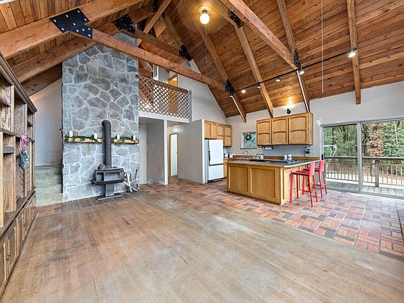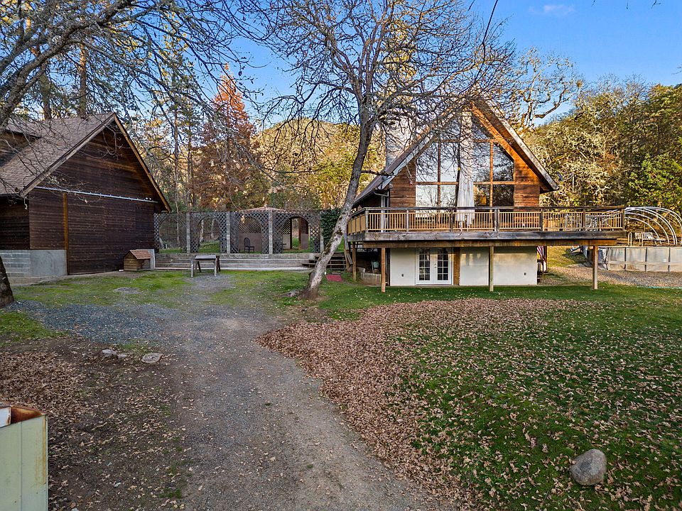 Custom A-frame home sitting on just under 6 ½ acres of usable land. Warm up by the wood burning stove while taking in the incredible views from the great room windows. Open floor plan w/ vaulted ceilings,red madrone hardwood floors,brick tile,and kitchen that includes a propane JennAir gas stove. Main level also offers 2 bedrooms and a full bath. Primary bedroom is located in the upper loft with a full bath and views of the orchard. Daylight basement with a ½ bath,laundry and bonus room.Wrap around deck to enjoying the outdoors on while taking in the fresh air.Large shop with 220 plugs,plumbed for air compressors,and a dumbwaiter elevator taking you up to the vaulted loft. The loft is perfect for storage or a flex/game room space.Outside you will find a Carport with RV hookups,storage shed with a concrete floor,gardens,green houses,fenced pasture, and gazebo.Plenty of room to ride ATVs,horses or just enjoy the peacefulness and privacy of rural living while being just outside of town.
