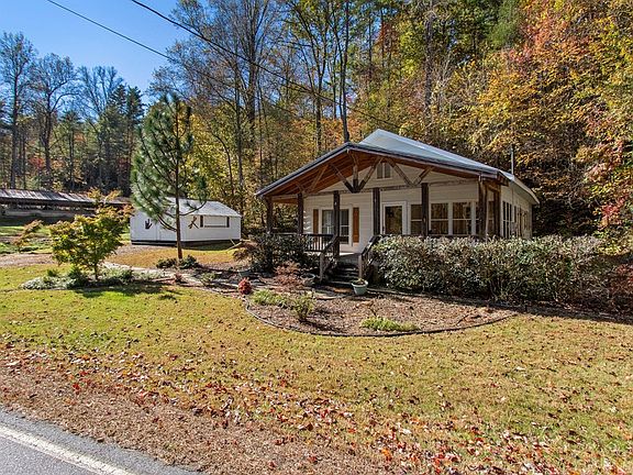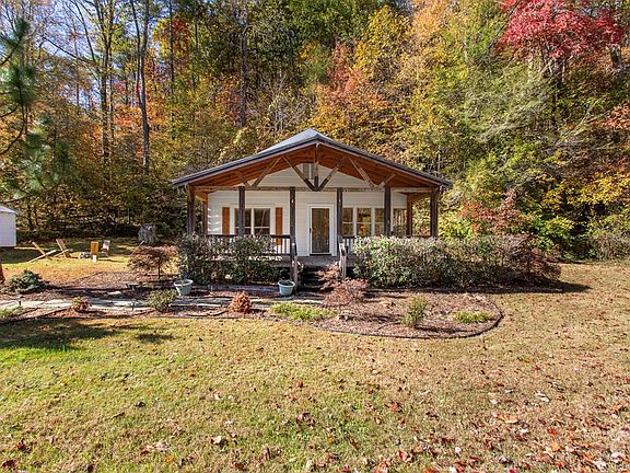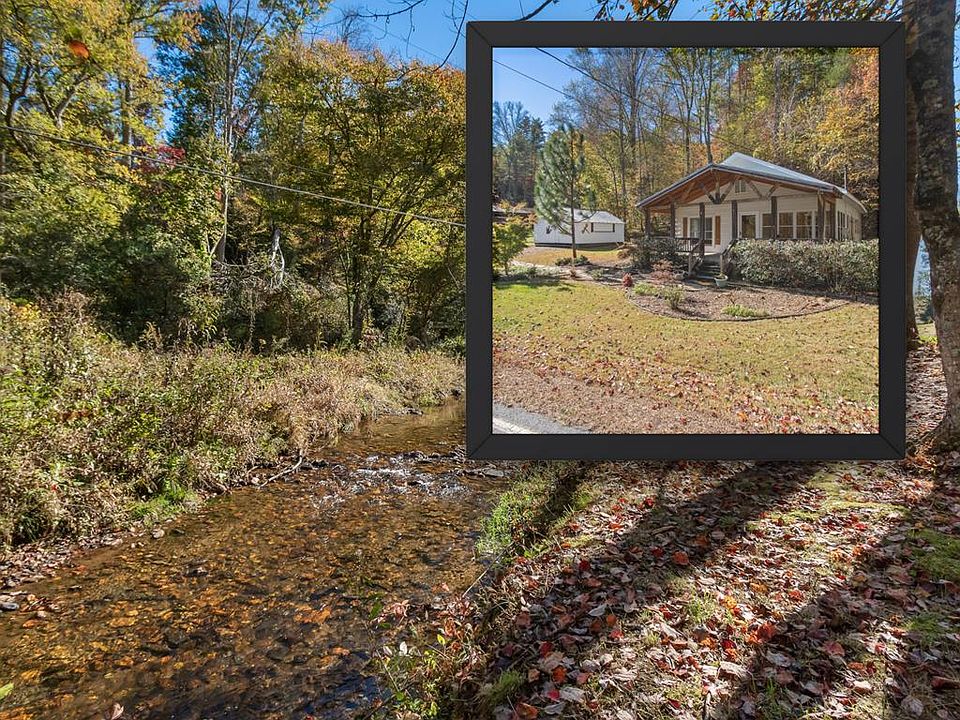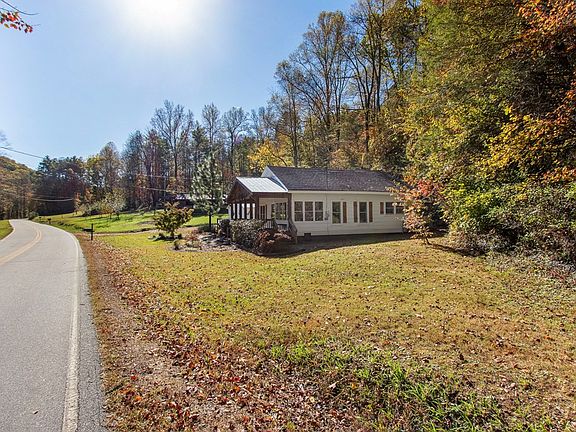 Creekside on Shoal Creek. This charming 2-bedroom, 1-bath farmhouse is set on over 2 acres of flat land with creek access. The inviting covered front porch provides a perfect spot to unwind and savor the fresh mountain air. Inside, the home has been fully renovated, featuring a bright sunroom with ample natural light, a spacious living room equipped with a built-in for a television, and two comfortable bedrooms. The bathroom includes a walk-in shower, and the laundry room adds convenience. The kitchen is generously sized, boasting plenty of counter space and cabinets, along with a bonus built-in bar for seating. Beautiful wood floors enhance the charm throughout the home. Outside, the level yard is ideal for children and pets, complete with a fire pit. The detached garage has been transformed into a stylish bar and entertainment area. The property also includes private hiking trails within the wooded lot, while the soothing sounds of Shoal Creek enhance the tranquil atmosphere. Across the street, a park-like setting features creek frontage, picnic tables, and a swing, making this idyllic retreat perfect for both full-time and part-time mountain living.