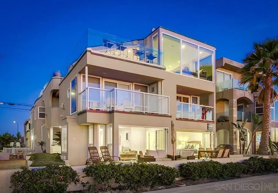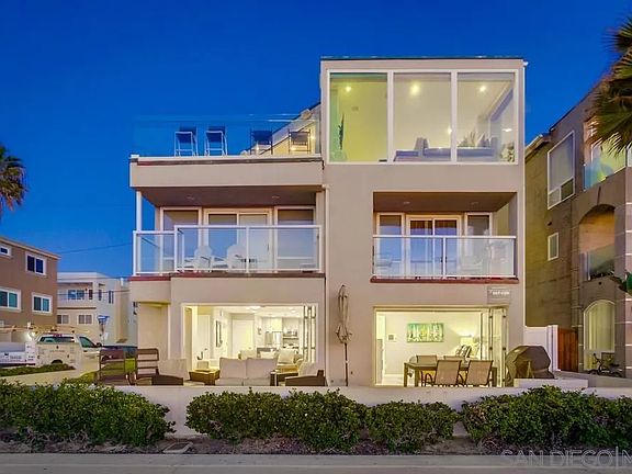 Every day feels like vacation in this designer-furnished, ground-floor oceanfront showpiece offering an extraordinary 50 ft of sand-frontage in north Mission Beach with sliding doors onto huge patio yard. Taken to the studs and rebuilt in 2015, the home blends quartz counters, large-format porcelain tile, wide pocket sliders, recessed LED lighting and custom cabinetry with curated pieces by acclaimed SD designer Carol Kaplan. An open concept great room frames sweeping blue-water and sunset views; the kitchen dazzles with stainless appliances, waterfall island and seating for six. Two generous bedrooms each accommodate a queen bed; the primary enjoys direct ocean views while the guest suite is ensuite. Two sleek baths feature new fixtures, jetted tub and glass-enclosed shower. Central A/C, stacked laundry, turnkey housewares and three Smart TVs ensure effortless living or premium rental performance. Step outside to an exclusive 50 ft beach-level patio with stainless BBQ, dining set, lounge chairs and secured beach-gear closet stocked with chairs, toys and boogie boards. Attached tandem garage has direct unit entry—rare along the boardwalk. Boutique four-unit building. One of the largest oceanfront patios in north mission beach. Walk to restaurants, coffee, Belmont Park and miles of boardwalk. Ideal as a full-time residence, second home or high-yield STR. Live, rent or relax— this stunner delivers postcard living at its finest.null