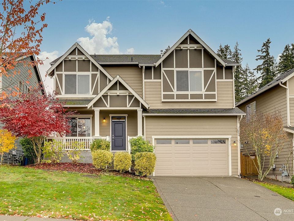 Extraordinaire! Pride of ownership. A relaxing porch accents the entry to elegant living and dining accented with trey ceiling and dark laminate hardwood throughout the lower level. Natural light floods the great room style, accented with a gas fireplace. A well-appointed kitchen has SS, great prep space, a huge pantry, and informal eating space. A grand 18x25 primary for calm and unwinding with a spa-like bath-shower, tub, and walk-in closet. Three large bedrooms are used as office, fitness, and bonus media room. Beautifully fenced and landscaped with an entertaining-sized deck & sprinkler system.Tons of storage in 480 SF garage. Enjoy stunning MT Rainier views from the upper level. Great location for schools, shopping, and I-5 access.