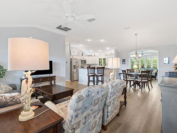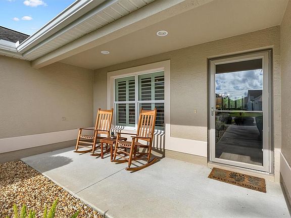 Welcome to this stunning Three Bedroom, Two Bathroom Designer home with 1559 Square Feet of Living Space, located in the Village of Fernandina in The Villages, Florida! As you enter through the front door you will immediately notice the Beautiful Palm Treed Landscaping through the windows of the Florida Room, giving the home a very Tropical, Coastal feel. Features of this gorgeous home include Luxury Vinyl Flooring and Crown Molding throughout the home, Plantation Shutters, and a Walk-In Shower and 2 Walk-In Closets in the En Suite Primary Bathroom. This Split Style home includes Two Guest Bedrooms and a Guest Bathroom with a Tiled Bathtub separating the space with a pocket door for privacy. Additional features include an Indoor Laundry Room with Cabinets, a Laundry Hanging Space and a cabinet enclosed sink, High Ceilings, a Screened Lanai and Patio, very Nicely Landscaped with Privacy Landscaping in the Back Yard, and a bright, sunny Florida Room for added Living Space. This meticulously maintained home is move in ready and a Turn Key Option is available. The property is conveniently located near Shopping, Medical Facilities, Restaurants, is near the Fernandina Pool and Recreational Center and is a short drive to both Brownwood and Lake Sumter Landing Town Squares where you will find Specialty Shops, Restaurants and Nightly Entertainment. Come take a look at this exquisite home soon as it will not be on the market for long!