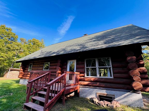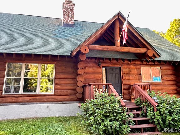 Step into the grandeur of this impressive log home, where soaring ceilings and timeless craftsmanship combine to create a truly regal living environment. Nestled on 15 acres, this home embodies the perfect blend of country living within town limits. Upon entering the home, you will find that it has been updated from top to bottom, inside and out. The entire exterior, including the sauna, has recently been meticulously cleaned, sealed, and stained. Inside has an open concept living room, dining, and kitchen with 23’ vaulted ceilings. The large open faced fireplace in the stone floor to ceiling chimney, is the centerpiece of this home. The main floor has a large master suite and attached full bathroom with laundry; which boasts a new walk in shower with tempered glass soft close doors, and a 16” rain shower head.Between the master and the living areas is another full bathroom. Upstairs is an open loft area to serve as a second bedroom, recreation area, or both, the possibilities are endless. New energy efficient light fixtures illuminatethe home and sauna. As well as newly installed stainless steel flues now line the beautiful stone chimney. While a new wood stove graces the full, partially finished basement, which boasts boundless opportunities for finishings, as well as providing additional square footage. In floor heating has been run and ready to be hooked up. Every detail has been attended to. All new energy efficient appliances throughout, as well as an on demand water heater. Complete with a 46’x40’ steel framed shipping container, commercial sized shop. Which features a concrete floor, 220 amp electrical service, a smart commercial LiftMaster door opener, a cozy wood stove, and a convenient workbench. 2 new 40’ hightop shipping containers also complete with lighting and electrical, providing the ideal space for all your projects and storage needs. Additionally, three truckloads of gravel have been added to the driveway. The yard has been tastefully landscaped to provide an even and inviting outdoor space, boasting apple, cherry, and pear trees, along with abundant thimbleberry bushes. To include nicely maintained trails that wrap behind the home to enjoy a peaceful walk or ride your ATV. The property also features a true Finnish sauna with a wood stove that has been tastefully updated, providing a serene retreat for relaxation. Sellers will leave the 1 year supply of wood for the winter months, matching bedroom furniture, lawnmower, appliances, mounted tree stand and dog kennel. With central air conditioning, the conveniences of this home can't be beat when you consider the privacy it provides. The home is located under one mile from the ORV/Snowmobile trail, Ahmeek, and Mohawk. Nearby are restaurants, a convenience store, and the Allouez gas station. Excellent location, right in the heart of the Keweenaw County. Come check out this beautiful getaway, which provides year round recreation options. Located 20 miles from Houghton!