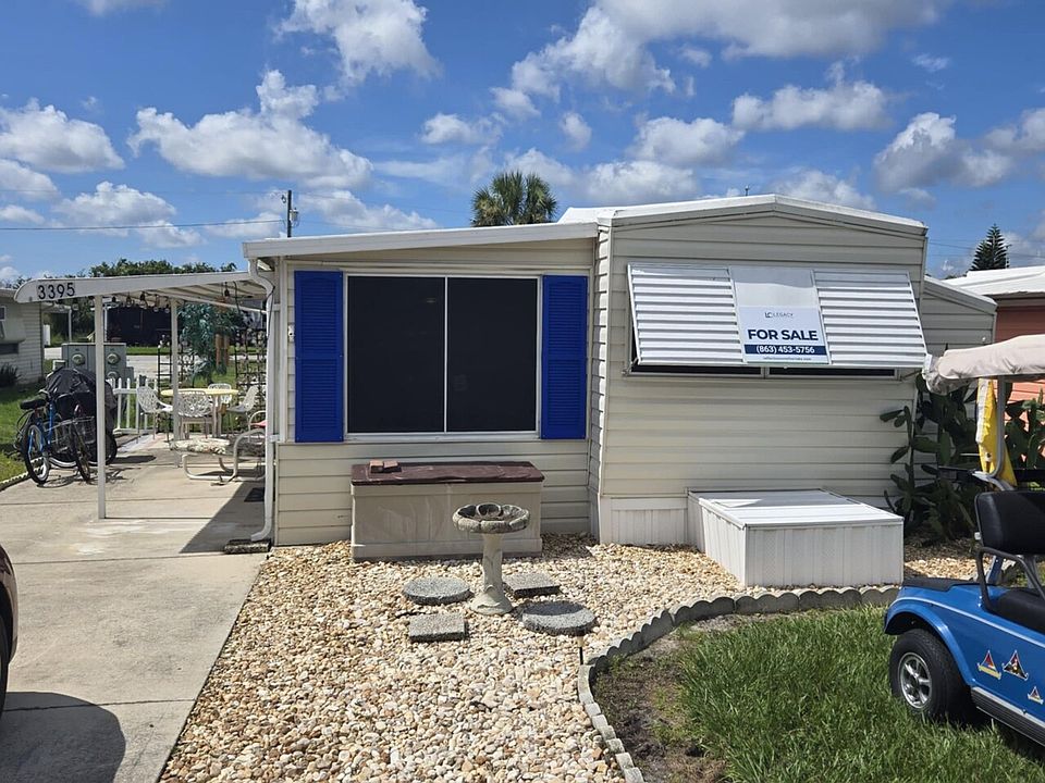 GOLF CART INCLUDED IN SALE!! Very sweet, fully furnished 1 bed 1 bath home with everything you need from washer and dryer, dishes, linens, bikes, and more. This home has been very well maintained and serviced regularly. It has an enclosed FL room that's very spacious, roof air, attached storage/laundry room with full size washer and dryer included. Main house has a dining area with tons of light, very nice size kitchen with dishes and appliances included walkthrough bathroom with full shower tub, adorable and spacious bedroom with queen bed and lots of closet space. Home also has side porch with covering. New AMS Roof, freshly painted, new skirting around home, new landscaping, new lighting in bathroom and kitchen, new blinds and more.