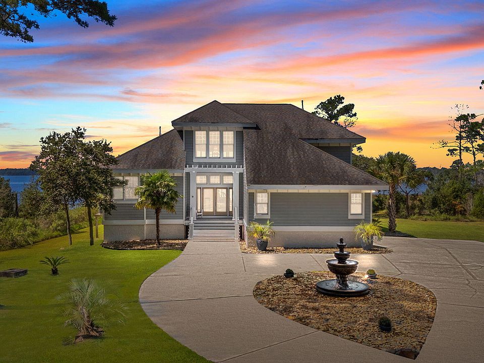Impressive Waterfront Estate on the Bay River! Exceptional 10-acre private estate offering sweeping river views and abundant frontage. A private, gated entrance, winding drive, and elegant fountain set the tone for this stunning home. Designed to capture the beauty of its setting, the two-story residence features walls of windows, wood floors, built-ins, and a gas fireplace. The spacious kitchen offers granite countertops, abundant cabinetry, and easy-care tile flooring, open to the living area for effortless entertaining. A versatile bonus room opens to a large screened porch overlooking the river. The laundry room adjoins the spacious 2 car garage and is steps off the kitchen. The main level primary suite is a private retreat with soaring ceilings, water views, and a luxurious ensuite bath. Upstairs, a loft/media room, two guest bedrooms, and a custom marble bath complete the space. Enjoy your own private dock, boat lift, and ramp—perfect for boating, fishing, and watersports. A rare opportunity to experience the best of waterfront living!