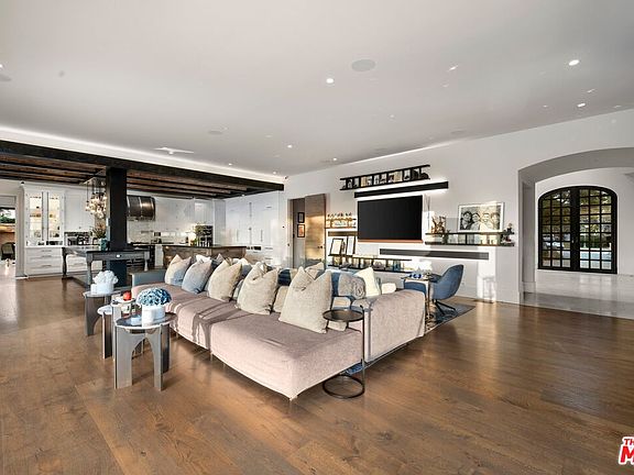 Experience ultimate exclusivity and unparalleled luxury in this French modern transitional. Located in Bel-Air's Stone Ridge Estates situated in a guard-gated community of only 11 homes, the residence is positioned at the back of the private cul de sac optimizing breathtaking city views and privacy. A very rare combination of privacy, 24 hour gated security, a modern home with 180 degree city and mountain views in an estate setting with large grounds. Step inside and discover expansive open living spaces, tasteful finishes and a seamless blend of classic and modern design with wide plank wood floors throughout There is a causal sophistication which gives you the optionality to live relaxed on a daily basis and entertain a large group in a magical setting. The heart of this home is its open-concept family room flowing into a gourmet kitchen equipped with a double island, 60 inch La Cornue dual oven range with 9 burners and top-tier appliances. There is a quaint breakfast area overlooking the garden and a formal dining and living room, where large windows fill the home with natural light. There is an elegant office overlooking the views, a top of the line fitness center, a poker-game room or optional maids room. Move upstairs to the private spaces which are tranquil and quiet and an inviting corridor takes you into the grand primary suite which has a luxurious bathroom, a generously sized walk-in closet and a terrace overlooking the skyline. There are four more well-proportioned bedrooms upstairs including a junior primary suite and a cozy den on the landing. There is a secondary back staircase for convenience and a basement level with polished concrete floors which holds multiple wine refrigerators and has wall to wall built-in cabinetry to maximize storage. The enchanting grounds has sprawling lawns, beautiful gardens and citrus, pomegranate, Jacarandas, Sycamores and Oak trees. The magnificent pool and jacuzzi anchors the yard and soaks up the sunshine throughout the afternoon. There is an outdoor barbecue-kitchen area as well as numerous moments to chill around three fire pits and take in the views. When you are in the mood for movement and fitness there is a sports court, outdoor wellness area with an infrared sauna and cold plunge. Available to Lease fully furnished. Located near several private schools.