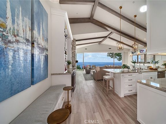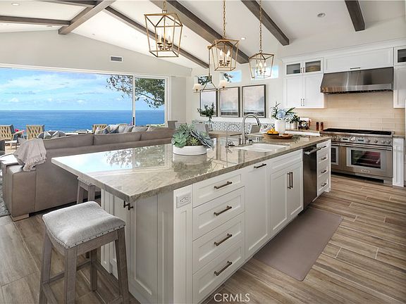 Warm fireplaceGourmet kitchenWine barCalifornia coastal interiorHigh-end custom upgradesCustom cabinetryBlufftop oceanfront park