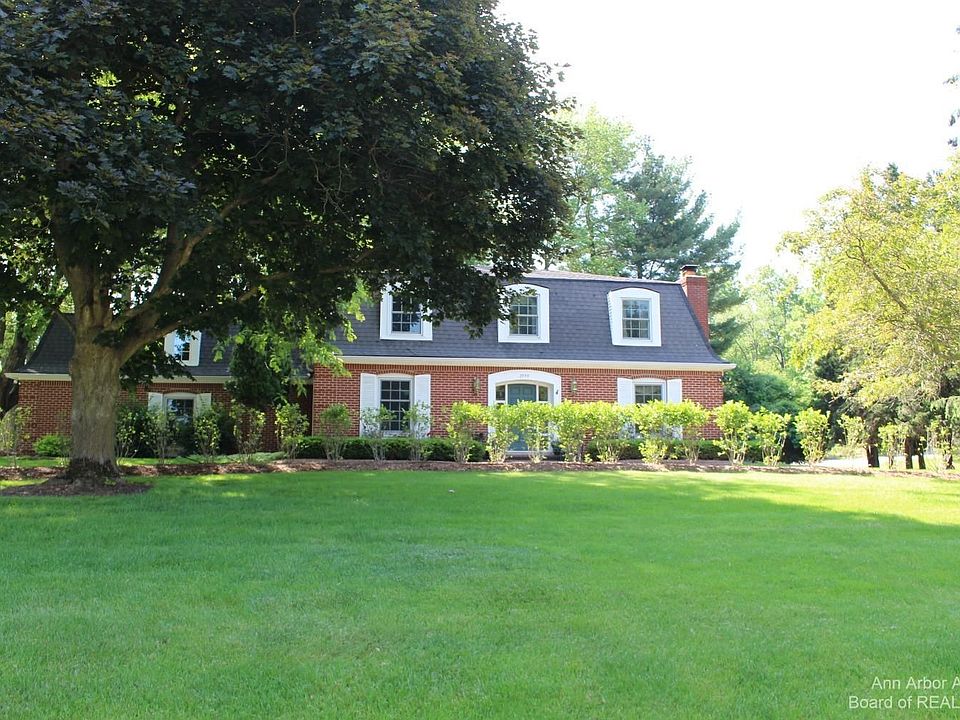 Entertain with ease in this stately brick colonial with circular drive on 1+ acre in quiet northwest AA suburb. Professionally landscaped with numerous trees and a screened in porch off dining room to enjoy it all including the deer. Entry level includes large foyer, Early American living room with wood floors, crown molding & gas fireplace and family room with built-in shelving/media center and 2nd gas fireplace. Kitchen is remodeled & includes casual table area, complimenting the formal dining room, and door wall to huge patio. Full basement is mostly finished and includes a 2nd study with built-ins and egress window to yard. Bedrooms are large and attic space over the oversized 2-car garage gives all the storage you could want. Well maintained. Natural gas generator. Septic tanks replaced in 2022.