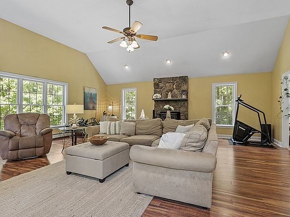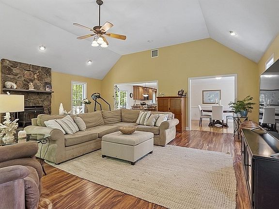 This stunning property boasts @3270 sq. feet of luxurious living space on two sprawling acres. Step inside and be greeted by a massive family room with cathedral ceilings, stately fireplace with wood stove insert, perfect for entertaining. This flows into the open kitchen with a chic center island, granite counters and spacious eating area. The formal dining room has gleaming hardwood floors that extend into the sun-filled living room. The main bedroom has an expansive walk-in closet and beautiful full bath. Incorporate the office/nursery into this space through the private entrance. Two more bedrooms and full bath finish the floor. But that's not all - head downstairs to discover a fully finished basement, complete with a bedroom, living room, kitchenette and handicap accessible full bath for added comfort and privacy. The oversized garage has heat and A/C. Step outside to the outdoor shower or deck for a refreshing experience with nature.