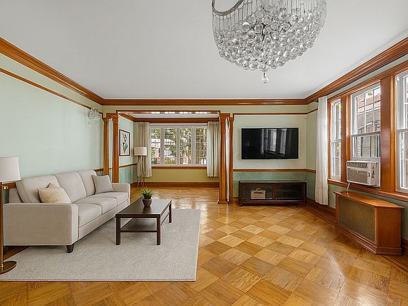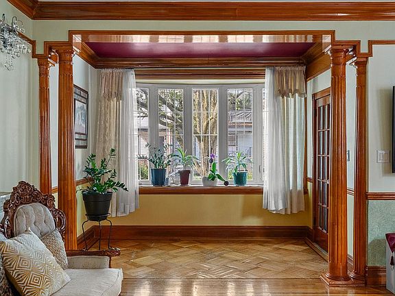 Step inside and you’re greeted by an interior filled with natural light and original details. The living room stretches wide, showcasing parquet hardwood floors, custom wood trim, and a crystal chandelier that catches the afternoon sun. The space feels both timeless and inviting—perfect for quiet evenings or lively gatherings.