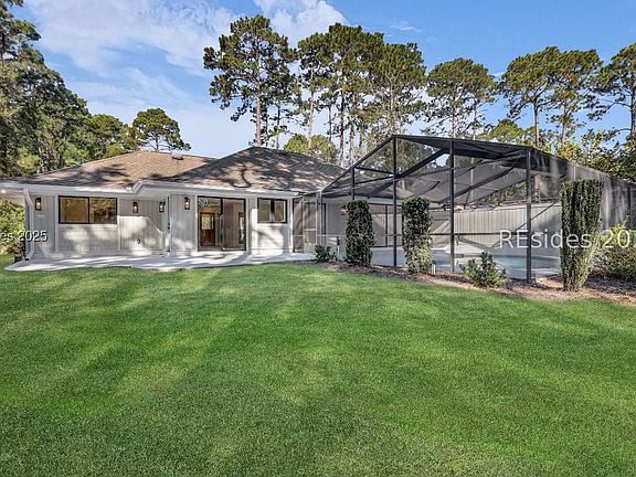 Completely reimagined from the studs up, this Hilton Head Plantation masterpiece blends modern sophistication with timeless Lowcountry charm. Offering 2,623 square feet of refined island living, the home's fresh coastal-chic design and wide-plank hardwood floors flow seamlessly through every space-all overlooking the serene third green of Bear Creek Golf Club. Thoughtfully redesigned for contemporary comfort, the residence showcases new high-end finishes throughout, from designer lighting and custom cabinetry to premium fixtures and appliances. Natural light pours into open, airy interiors where the great room's gas fireplace and built-ins complement the chef's kitchen-featuring a spacious island, marbled Quartz countertops, panel refrigerator, beverage fridge, and a hidden back pantry. Every detail reflects a harmonious balance of modern elegance and coastal warmth. The single-story layout offers effortless living, extending into a tranquil office/flex room and two guest bedroom with beautifully finished jack & Jill bath. The primary suite is a private retreat, with a soaring tray ceiling, direct access to the screened lanai, and a spa-inspired en suite bath boasting dual vanities and a stunning walk-in shower wrapped in custom stone.Outside, resort-style living awaits. A sparkling and newly refinished swimming pool shimmers beneath a canopy of mature trees, fully screened for year-round enjoyment and minimal maintenance. Expansive patio provide space for grilling, dining, and entertaining-all framed by peaceful golf views and lush privacy. Every inch of this home reflects its complete structural and aesthetic transformation-a meticulous renovation that brings new life, beauty, and lasting value. With its elevated finishes, serene setting, and inspired design, this HHP gem captures the essence of Hilton Head Island living at its finest.