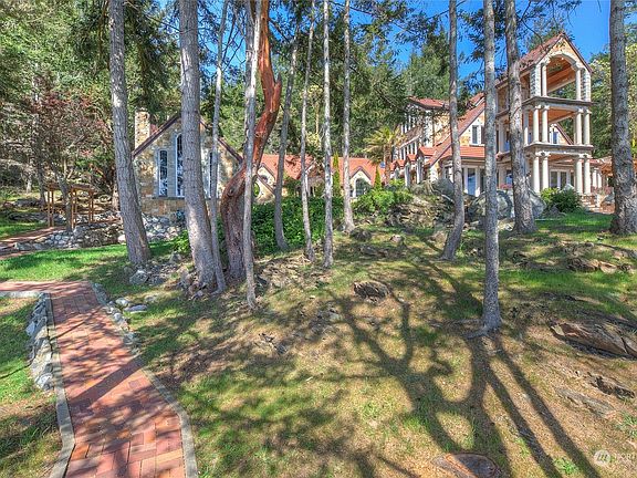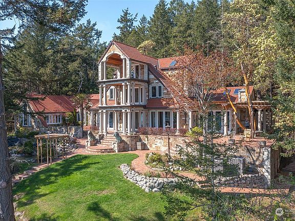 REMARKABLE PRIVATE WATERFRONT ESTATE W/FULLY FUNCTIONAL BOATHOUSE ACCOMMODATING 27' VESSEL on second buildable lot! You don't need dock when you can literally dry dock your own boat! 700+' of beautiful waterfront, private beach, stunning 180-degree southern views & amazing 2 gig up and down fiber! Developed as unequaled retreat for silent film stars, current owner spared no expense on nearly complete exquisite restoration - hand cut stonework, Ludowici tile roof, copper gutters, more. Vaulted ceilings, grand rooms, floor to ceiling windows, grand decks all w/unequaled water views. Brick paths meander through courtyards, ponds, parked grounds & fountains. Unfinished areas ready for new owner to personalize this incredible island retreat.