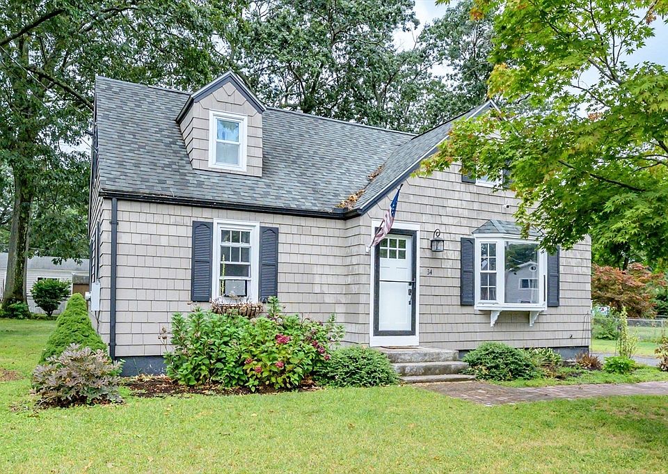 Welcome Home to this Charming Cape! Natural light floods every room, creating a warm & inviting atmosphere. As you enter, you’ll be greeted by a convenient mudroom featuring built-in shelves. The updated kitchen offers ample cabinetry for all your storage needs. The cozy living room is perfect for relaxing, complete with hardwood floors & a stunning bow window. The main floor boasts 2 spacious bedrooms & a full bathroom. Upstairs, you’ll find a beautifully remodeled space featuring hickory flooring, a 1/2 bath, & either 2 additional bedrooms or a luxurious primary suite. The open area upstairs offers endless possibilities for a nursery, home office, or den. Enjoy the outdoors in your private, flat backyard—perfect for pets, entertaining guests, or simply unwinding. Additional highlights include a 2-car garage with attic storage, replacement windows throughout, & a partially finished basement. This home is ideally located with easy access to shopping, dining, & the Mass Pike.