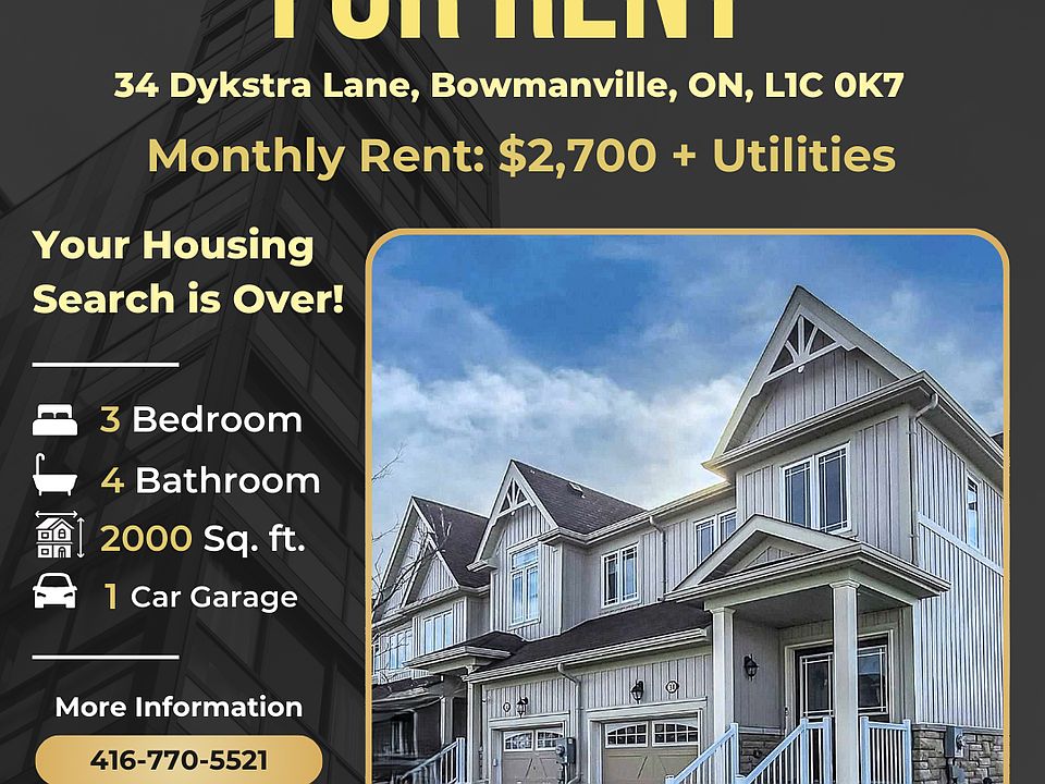 Address: 34 Dykstra Lane, Bowmanville, ON, L1C 0K7Monthly Rent: $2,700 + UtilitiesAvailable: ImmediatelySquare Feet: 2,000Size: 3 Bed | 4 BathProperty Type: TownhouseParking: Included