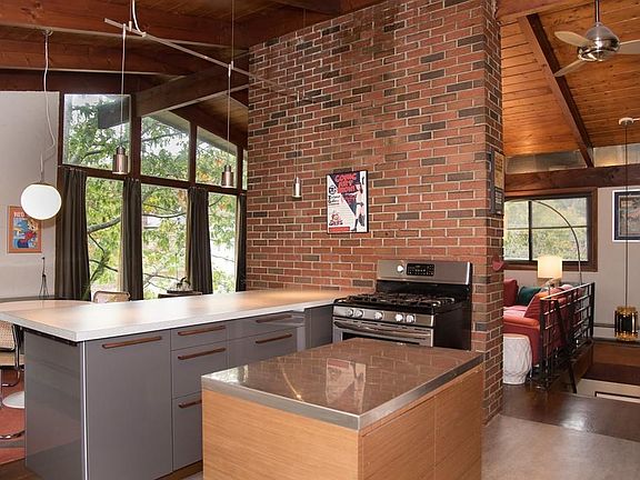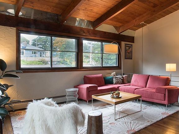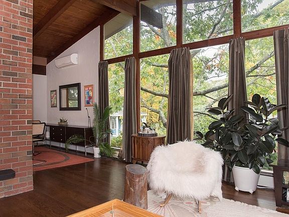 Come fall in love with this mid-century modern style home nestled into rock and located in a new and booming Malden. The cathedral wood ceilings throughout, along with floor-to-ceiling windows in the living room make for an airy, bright atmosphere. Renovations include a contemporary style kitchen with a custom island, backsplash and pulls, foyer with a fireplace and sliding barn doors, both bathrooms, and patio with custom designed railings. There are hardwood floors all through the house and a central brick chimney with two fireplaces. Everything about this home feels cool and chic, and it does not disappoint when you step outside. The gorgeous Ipe front walkway, sophisticated patio with a fire pit for outdoor living. You are steps away from the Middlesex Fells Reservation and an eight-minute walk to the Oak Grove train stop. It's walkable to Malden Center, with great restaurants and a short drive to I-93, yet far enough away to enjoy the quiet, suburban environment.