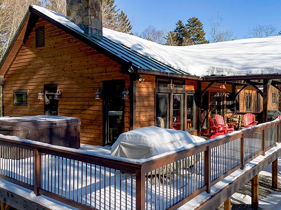 Stunning Rustic Retreat with Modern Comforts. Nestled in a peaceful, partially wooded lot, this property exudes character and charm. Fully renovated in 2013, it’s been meticulously maintained and offers an inviting, cozy atmosphere. Practicality meets style with a large mudroom and laundry area that includes slate and tile flooring w/ radiant heat. A massive great room has a fieldstone fireplace, vaulted ceilings, rustic exposed beams, and gorgeous wood ceilings. Large windows flood the space with natural light, highlighting the wide pine floors. The chef’s kitchen is a true standout, boasting custom features including stainless steel appliances, a wine fridge, and granite countertops. The custom woodwork throughout the home was harvested directly from the property adds to the unique charm. The home offers multiple living areas, including a walkout lower-level family room. The master suite has its own gas fireplace, perfect for unwinding after a long day. The luxurious hot tub outside provides an extra touch of relaxation. The 2-car garage features a beautifully finished space above, currently used for entertaining, adding even more flexibility to the home’s layout. The exterior boasts wavy cedar siding with stone accents and a standing seam metal roof, giving the home lasting durability and curb appeal. The property offers privacy while still being close to The Hermitage Club, Mt Snow and the Village of Wilmington.