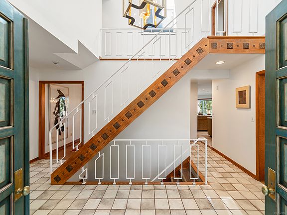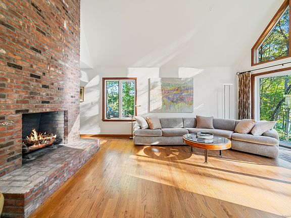 A showcase of late-Mid-Century-inspired architecture, this exceptional custom-built home combines striking design with a tranquil private setting just minutes from shopping, dining, and recreation. Beautifully maintained and thoughtfully designed, it offers an ideal balance of sophistication, comfort, and convenience. Vaulted cathedral ceilings enhance the home's airy, light-filled aesthetic. The dramatic entry foyer with its soaring ceiling and striking modern staircase immediately sets the tone for a residence that stands apart in both design and detail. An immense two-story, floor-to-ceiling brick fireplace anchors the Great Room, while another in the Premier Bedroom adds warmth, ambiance, and timeless charm. The spacious Premier Bedroom Suite features "His & Hers" connecting bathrooms with spa-inspired finishes. A huge eat-in kitchen, surrounded by walls of glass, overlooks the wooded landscape and the in-ground pool-an ideal space for cooking, entertaining, or simply enjoying nature. Outdoors, the property is a serene oasis of natural beauty, highlighted by native wildflowers and several meandering stonewalls. Expansive patio walkways wrap the home, providing generous space for both gatherings and quiet reflection. Set on lush, park-like grounds, it's perfect for peaceful nature walks or simply taking in the view. With sunlight streaming through skylights and two-story windows, this rare home offers privacy, luxury, and inspiration-truly one-of-a-kind.