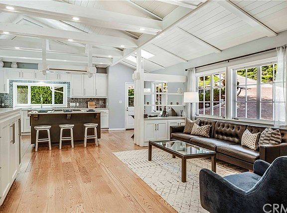 Located in the Empty Saddle neighborhood, one of the most tranquil and desirable areas in Rolling Hills Estates where the streets are lined with white picket fences and tall mature trees. Upon entering, you'll immediately feel the warmth and brightness this beautiful home offers with its high wood beamed ceilings, crown molding, skylights, open floor plan and lots of natural light. Earthy muted tones and stunning wood floors further enhance its sleek elegance. The remodeled kitchen is truly unique with artful wood beam designs and includes: a cooking/breakfast island, quartz countertops, high end appliances, under cabinet lighting, ample cabinets, and much more. The living room is perfect for relaxing by the fireplace. Or, step onto the deck for stunning pastoral views. The private master bedroom features high ceilings, lots of natural light, views, a spacious walk-in closet and a newly remodeled master bath with separate tub and shower. An entertainment room with full wet bar and wine/mini fridge, built-in book case and fireplace is downstairs. From here, you can enter the spectacular backyard featuring an in-ground pebble-finish pool, a sauna room with separate shower, above ground Jacuzzi, lush landscaping, mature fruit trees, large patio, storage areas, a barn, access to horse trails and lots of planters, too...ideal for starting that vegetable garden! Perfect for a family, for entertaining, or those who want a place with a little peace and tranquility.