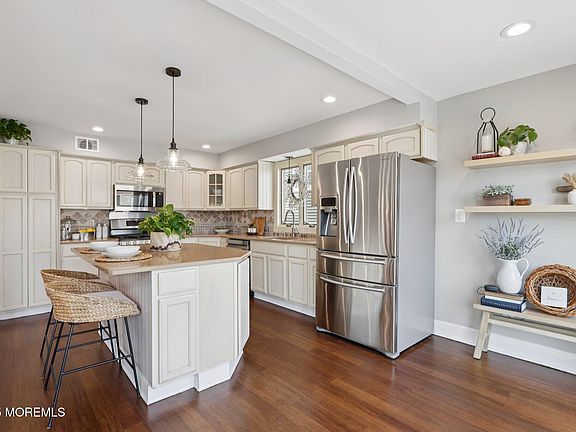 Welcome to your dream coastal retreat in one of the most desirable waterfront communities-Shore Acres! Just minutes from the open bay, this beautifully renovated 4-bedroom, 3-bath home offers luxury living inside and out. Step into the two-story foyer and experience the open floor plan, featuring newly refinished bamboo floors and elegant custom moldings throughout. The gourmet kitchen is a showstopper with a large center island, quartz counters, stainless steel appliances, and a built in wine fridge-perfect for entertaining. The first floor includes a versatile den/office and a full bath for convenience and flexibility. Finish with an oversized laundry room and new Andersen sliders leading to true outside oasis. Feel like your on vacation in your own backyard, featuring a freshly landscaped paver patio, complete with a fully stocked pavillion with an outdoor kitchen and bar, and a brand new 50-foot dock and bulkhead- ideal for boaters and waterfront living enthusiasts.