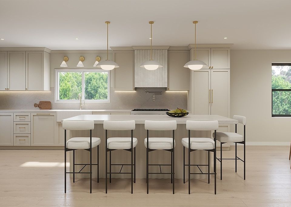 Fluted stone fireplaceFluted islandBi-level unitWarm modern kitchenWhite oak hardwood floorsBuilt-in coffee stationLed-lit built-ins