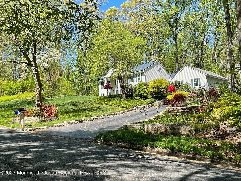 Bring the Dream to Life! This energy efficient 5 Bedroom Center Hall Colonial beautifully positioned in a desirable & private Holmdel setting is sure to impress. Greeted by a welcoming double door entry with marble flooring in the foyer, the spacious floor-plan features hardwood floors, decorative moldings & ample living spaces throughout. Living Room & Dining Room bask in natural light & private Office is complete with custom oak built-ins for all of your work from home needs. Custom open concept Kitchen & Family Room. The Family Room features a wood-burning fireplace with brick surround & sliding doors to the outdoor composite deck. The custom designed Kitchen features high end appliances, island with prep sink, baking prep area, eat-in peninsula island, built-in desk area & 4-panel bi- fold glass panel glass doors to outdoor deck w/motorized retractable awning overlooking the patio & private backyard. Conveniently appointed mudroom with sink & laundry area provides access to an attached 2 car garage with epoxy floor and storage cabinets. First floor additionally offers an en-suite bedroom and/or additional office/playroom space to suit your lifestyle. Primary Bedroom Suite features walk-in closet, en-suite bath with jetted tub & access to an expansive outdoor balcony overlooking private property. 3 additional spacious bedrooms with hardwood floors, ample closets & full hall bath complete the 2nd floor. A spacious finished Lower Level is complete with full bath, 2 private rooms for additional office space/gym & ample storage options. The property boosts beautiful botanical-style perennial gardens with many different colorful flowers blooming from early April to October. Home-owner newly upgraded Solar panels. 4-zone sprinkler system covering both front and back yards which includes custom built compost bins. Look no further-this home checks all the boxes! Conveniently located near iconic Bell Works, MSK, NYC transportation, beautiful parks & Jersey Shore beaches.