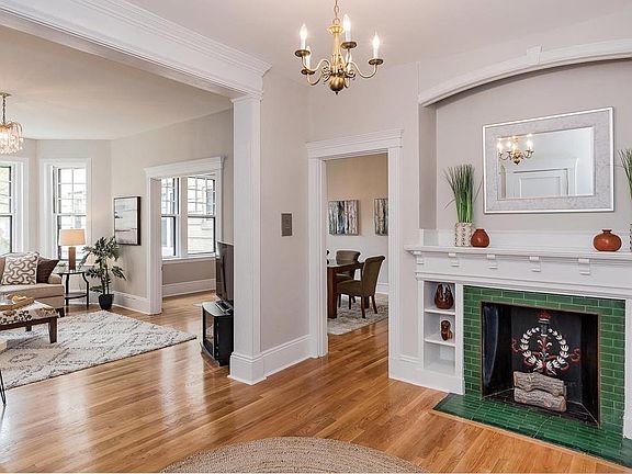 Nicely set back from the street, in a courtyard building, this stunning floor-thru unit has an open floor plan with high ceilings and fabulous natural light. The gracious foyer, with a decorative fireplace, built-ins, and beautiful woodwork detail leads into an elegant living room with an alcove and a bay window overlooking the flourishing courtyard. The floor plan continues into the large dining room and wonderful eat-in kitchen with a dining area and access to screened-porch. There are two spacious, sun-filled bedrooms and a third smaller bedroom/office. One of the full bathrooms was renovated in 2019 and the other has a shower stall. Also included are in-unit wash/dryer, abundant storage, additional storage in the basement, and an extra-long assigned parking space. This beautiful courtyard building has had many upgrades, and is close to C and D line, shops, and Dean Park