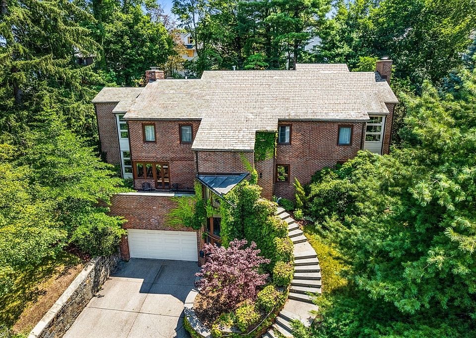 This striking modern brick home offers the perfect blend of space, light, and elegance. Spread across three levels, the home welcomes you with a dramatic atrium-style foyer. The open-concept living and family rooms flow beautifully for modern living and entertaining. The spacious layout includes 5+ bedrooms and 3 and half bathrooms, offering comfort and flexibility for family and guests. French doors throughout the main level lead to a private backyard oasis—featuring a sloped garden, tranquil waterfall, and a beautiful bluestone patio ideal for outdoor dining and relaxation. There is also a front facing 2nd level patio with western exposure. This home also includes a 2 car garage. With natural light pouring in from every angle and thoughtful details throughout, this is a truly special property that combines contemporary design with warm and welcoming spaces—both inside and out.