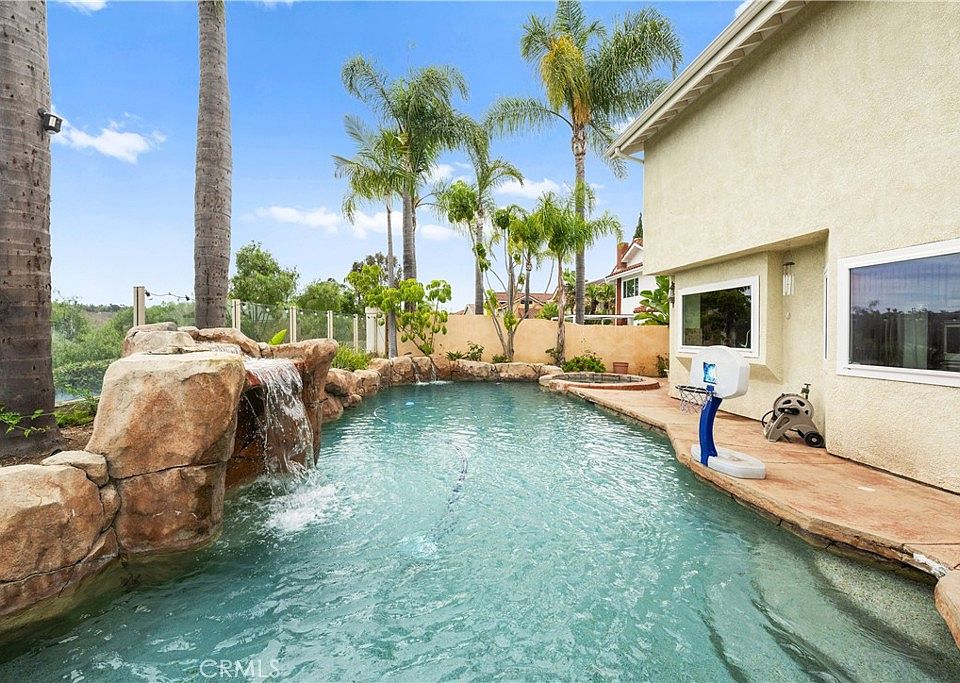 Outdoors, the backyard is nothing short of a resort escape—a custom pool with cascading waterfalls, relaxing spa, built-in BBQ, and tropical landscaping accented by tall palms. Fruit trees flourish throughout the property, including lemon, pomegranate, and persimmon.