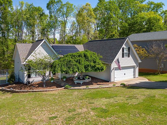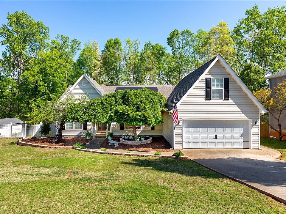 Well-appointed ranch retreat that backs up to a creek, No HOA & is USDA Eligible! Nestled on a lush ¾-acre lot that backs up to a must see creek area. Amazingly updated 3–4 bedroom ranch offers the perfect blend of comfort, style, and convenience—with no HOA restrictions. Thoughtfully designed, the home features a spacious flex room above the two-car garage, ideal for a guest suite, home office, or playroom or 4th bedroom. Step inside to discover a living room with vaulted ceilings and a striking fireplace—perfect for relaxing or entertaining. The elegant dining room boasts a trey ceiling and provides the perfect backdrop for hosting dinner parties or enjoying everyday meals in style. The eat-in kitchen is a chef’s dream, featuring newer quartz countertops, an abundance of white cabinetry, stainless steel appliances, a breakfast area, and a large pantry. Retreat to the serene master bedroom complete with a trey ceiling, beautifully designed walk-in closet with built-in shelving, and a luxurious en suite bath featuring a ceramic tile shower, jetted tub, and dual vanities. Enjoy energy savings year-round thanks to the included solar panels, and savor the outdoors from your covered back deck with double-door access and two levels of entertaining space that overlook the beautifully manicured backyard. The yard is fenced, with the property extending well beyond for even more room to roam. Also included is a shed that offers additional storage or the perfect spot for a small workshop. Recent updates include Roof/solar in 2021, new carpet, HVAC, quartz countertops, an expanded back deck, enhanced landscaping, and much more. All appliances stay, including the washer & dryer as well. Located in a USDA-eligible area. Conveniently positioned near shopping, restaurants, schools, hospitals and BMW. It also provides easy access to Greer, and is ideally situated between Greenville and Spartanburg. Don’t miss this opportunity to own a slice of tranquility with modern updates and timeless charm.