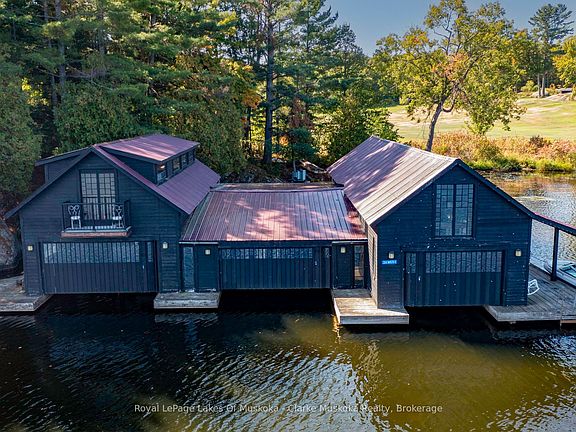 A truly rare and exclusive opportunity to own a piece of Beaumaris history on coveted Tondern Island. This remarkable water-access-only boathouse is perched on a prime stretch of shoreline offering the best of both worlds: beautiful eastern views over the lake at sunrise and unrivaled sunset vistas to the west, overlooking the 7th fairway of the Beaumaris Yacht Club. Originally built in the 1940s to house the Edith Anne Steamship, this beautifully preserved heritage boathouse blends historical charm with modern potential. Zoned OS3 (Commercial Open Space), the property allows for a variety of flexible uses including marine storage and service, or even as a private club or personal retreat. Whether you're looking to showcase your boat collection, create a private escape, or invest in a one-of-a-kind waterfront asset, this property is an unparalleled opportunity in Muskoka's most prestigious enclave. A dream for boat enthusiasts and entertainers alike, the boathouse features three oversized slips: Slip 1: 50' x 12'; Slip 2: 52' x 14'8"; Slip 3: 38' x 14'8" Two generous cigar decks, one east-facing and one west-facing, provide the perfect settings to relax and entertain guests, taking full advantage of the all-day sun and panoramic views. The upper level offers substantial storage and could be customized to suit a variety of needs.