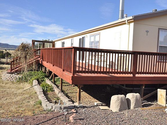 1508 sq ft, 3BD/2BA home on 28.22 fenced & cross fenced ac. Access is good on privately maintained roads, only 0.4 mi from Hwy 61 & 20 mi from Show Low. Central AC new in 2019 & interior paint 5 years old. New shingle roof being installed prior to close of escrow. Home skirted w/cinder block. Private well into the Coconino Aquifer, providing good, abundant water. Well shared w/neighboring property (recorded 2 way well share agreement), & equipped w/2500 gal holding tank. Large fenced garden area, & a 10 x 12 storage shed. Fireplace in living room to help keep home warm during winter. Guest bath same as master, w/garden tub, separate shower, dual sinks. Large back deck to enjoy the great views from. Driveway alarm notifies when vehicle enters property. Call for an easy to show appointment.