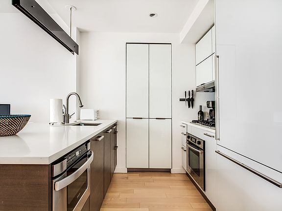 This incredible apartment fully captures a modern luxury lifestyle, featuring a spacious layout with a stunning gourmet chefs kitchen, oversized windows, and great closet space. The open kitchen boasts ample white lacquer cabinetry, premium counters, a breakfast bar with built-in storage, as well as top-of-the-line stainless steel appliances, including a microwave, and a dishwasher for modern convenience.