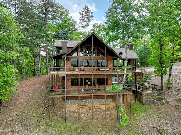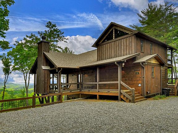 Overlooking stunning mountain ranges and with some of the best sunsets in the North Georgia Mountains, Cohutta Chalet embodies the luxury mountain experience complete with three levels of indoor and outdoor living, close proximity to Cohutta Wilderness and the Benton Mackaye Trail, sprawling outdoor space, and comfortable interior furnishings. Boasting walls of windows, soaring cathedral ceilings, a rich rustic interior, gourmet kitchen w/ S/S appliances, granite countertops and ample cabinetry. Al-fresco dining made perfect with a large dining area and doors out onto the sprawling outdoor decks perfect for entertaining. Main level living space is complimented by a large stone fireplace inside and outside on the attached party deck. Bask in the incredible long-range mountain views from all rooms in the home. The bedrooms on the main level and upper floor could be considered "primaries" with attached luxury ensuites complete with walk-in tile showers and dual vanities. On the terrace level, find a large basement den with another stellar stone fireplace, media area, billiards area, full wet bar/coffee bar, and a full bunk room w/ full bathroom. Terrace level deck has a large jacuzzi area, outdoor swing bed, observation area, and path to a large fire pit. Surrounded by rich wildlife all while easily accessible and minutes to Downtown Blue Ridge. The chalet is sold with an attached lot off the back of the driveway with its own separate mountain views and the perfect area to build a future garage or ADU. Sold fully-furnished and turn-key, all you'll need is your tooth brush and hiking boots. Call today!