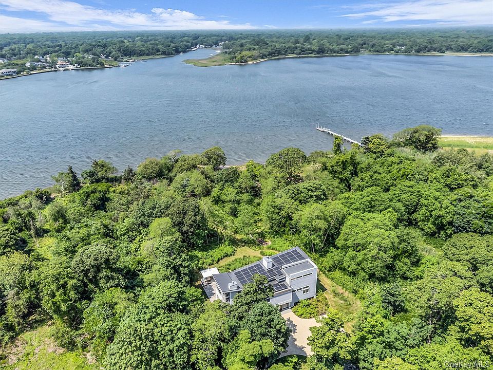 Step outside to your private resort on a spacious ipe wood deck featuring a heated saltwater pool with UV filtration, bluestone surround and automatic cover. The deck area is designed for entertaining or retreat with a stylish kitchenette, several zones for relaxing in the shade or sun, changing room and outdoor shower all nestled around a professionally designed native meadow. Follow the grassy mowed path that winds through the wetland to your very own western exposed waterfront with two natural beaches and a shaded deck area to enjoy a breezy sunset meal or cocktails, launch paddle boards or kayaks, hop in your boat, or just lounge with a book. Once part of the historic, grand 19th c. Masury Estate, the home is now registered on the Pollinator Pathway and sustainably designed for the 21st c. inside and out with all electric heating and cooling powered by 47 owned solar panels. Other features include hardwood floors throughout, ample storage, a 2-car garage, security system and electric fence that provides 2 acres of roaming for pets. You won't find a more private, tranquil and well-appointed setting. This is a unique opportunity to acquire 4 acres of pristine nature and 150 feet of beach frontage with direct access to Moriches Bay.