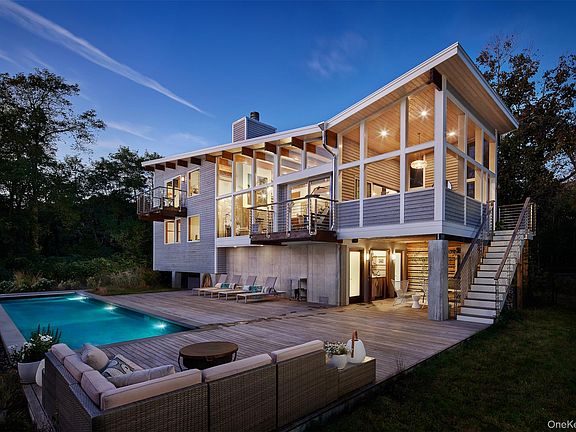 The main level impresses with a vaulted ceiling, dramatic wood beams and floor-to-ceiling windows overlooking the water with an open-concept layout uniting the kitchen, dining and living areas. A sleek, chef inspired kitchen with natural stone countertops, induction cooktop, wine fridge, concealed pantry and laundry area flows seamlessly into the living and dining spaces highlighted by a cast concrete wood-burning fireplace with floating hearth, a balcony to the west and a sliding glass wall to the south that connects to a high ceiling screened-in porch with wood-burning fireplace for year-round enjoyment of nature, birdsong and the sound of crashing waves from nearby Fire Island.