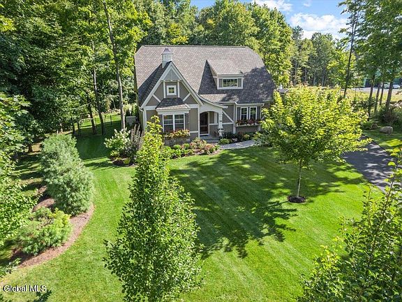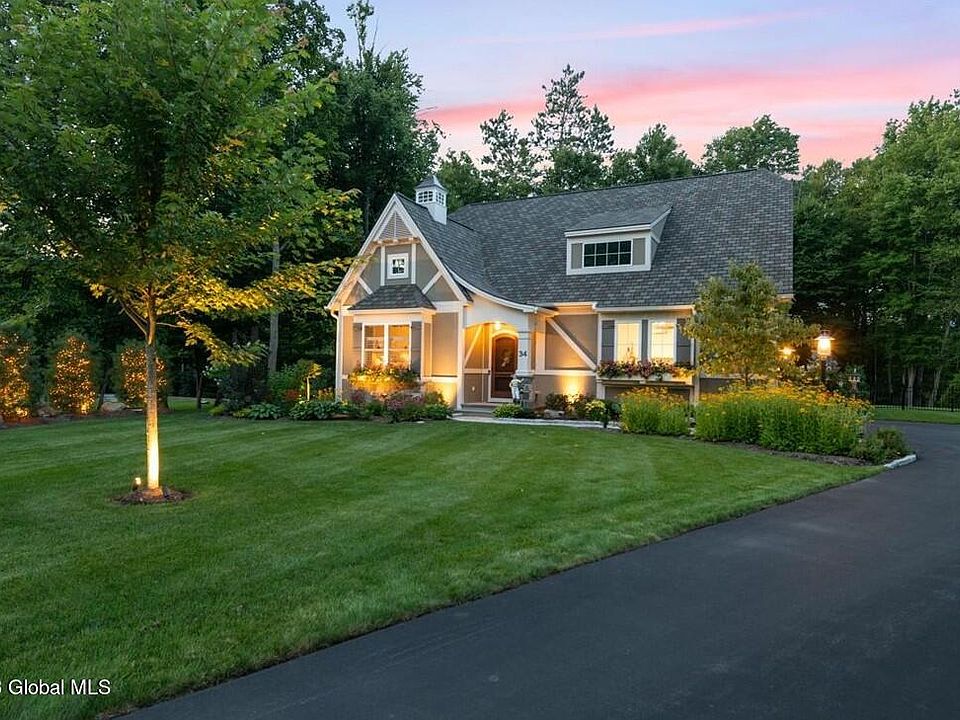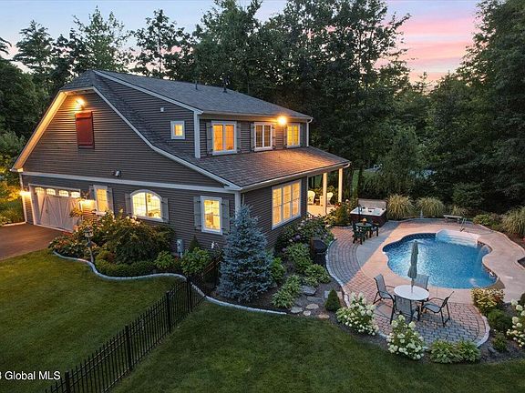 Welcome to this English cottage style 5 yr young custom home! First floor primary bedroom suite along with two ensuite bedrooms on the second level with an adjoining family room. Meticulously maintained vibrant and lush perennial gardens surround this charming home. All will enjoy the heated salt water in-ground pool and the relaxing hot tub just steps from the rear covered porch. Mountain views from the kitchen window and garden views at every turn. Many custom features include an automatic generator, hardwood floors, gorgeous gourmet kitchen, security system, designer lighting, specialty kitchen cabinets, gas cook top, shed with lights, quaint office nook, etc. Saratoga Springs school district!